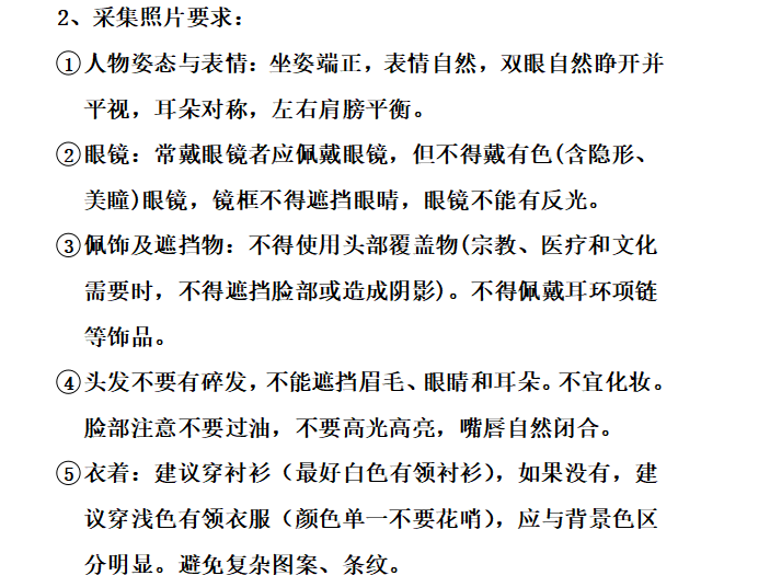 (2)请按影像拍摄要求(详见附件1:女生拍摄要求、附件2:采集照片要求)免冠、着正装;注意保持着装和容貌整洁,不穿黄色、蓝色无袖上装,不佩戴任何饰物,露出眉毛和耳朵。
