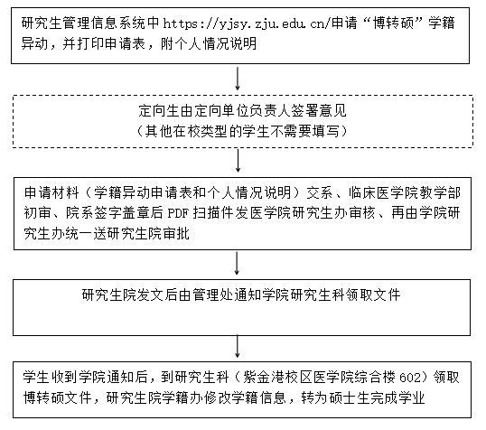 根据《浙江大学研究生学籍管理实施办法》(浙大发研〔2017〕115号)文件的规定:“直博生入学3年以上、硕博连读生转博后1年以上者,由于各种原因,不宜继续攻读博士学位但可以达到硕士研究生学业要求的,经本人申请,导师(或导师组主导师)和学院(系)同意、研究生院审批,可以转为攻读硕士研究生。”为进一步规范研究生管理,现将医学院博转硕相关事项通知如下: